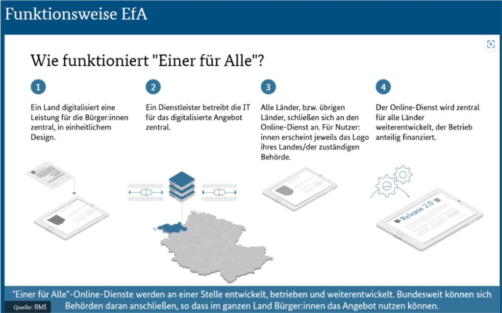 Einer für Alle („EfA“) bedeutet konzeptionell, dass ein Land eine Online-Lösung für eine Verwaltungsleistung einmalig zentral mit einem Landes-IT Dienstleister entwickelt sowie betreibt und anderen Ländern zur Mitnutzung bereit stellt. Ziel ist ein einheitlicher Zugang zu nutzerfreundlichen Verwaltungsleistungen.